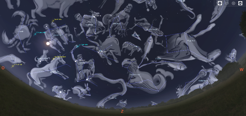 Waarnemers aan de slag in de koepel van de sterrenwacht (boven) en de nachthemel in november/ december (onder)